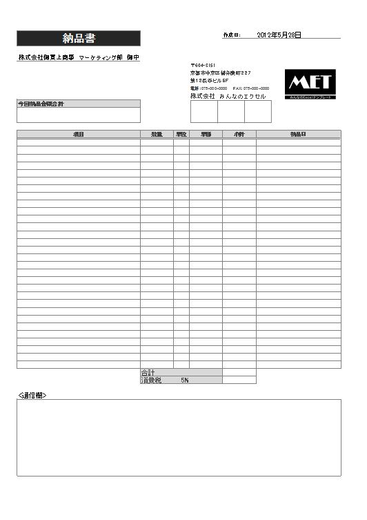 小計や合計、消費税などを自動計算で表示させることができる式をあらかじめ入力したシンプルなExcelの納品書です。